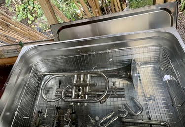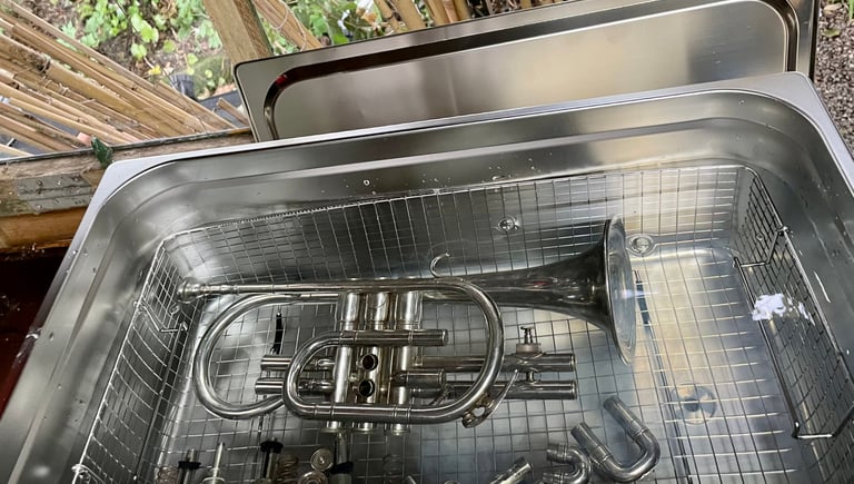 Instrument fully dismantled and ultrasonically cleaned (ultrasonic up to size French Horn)